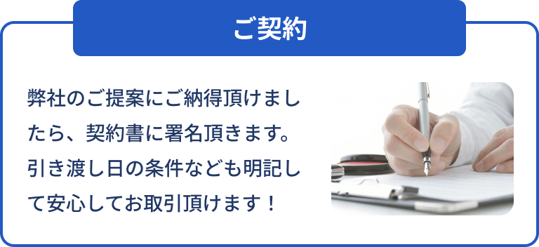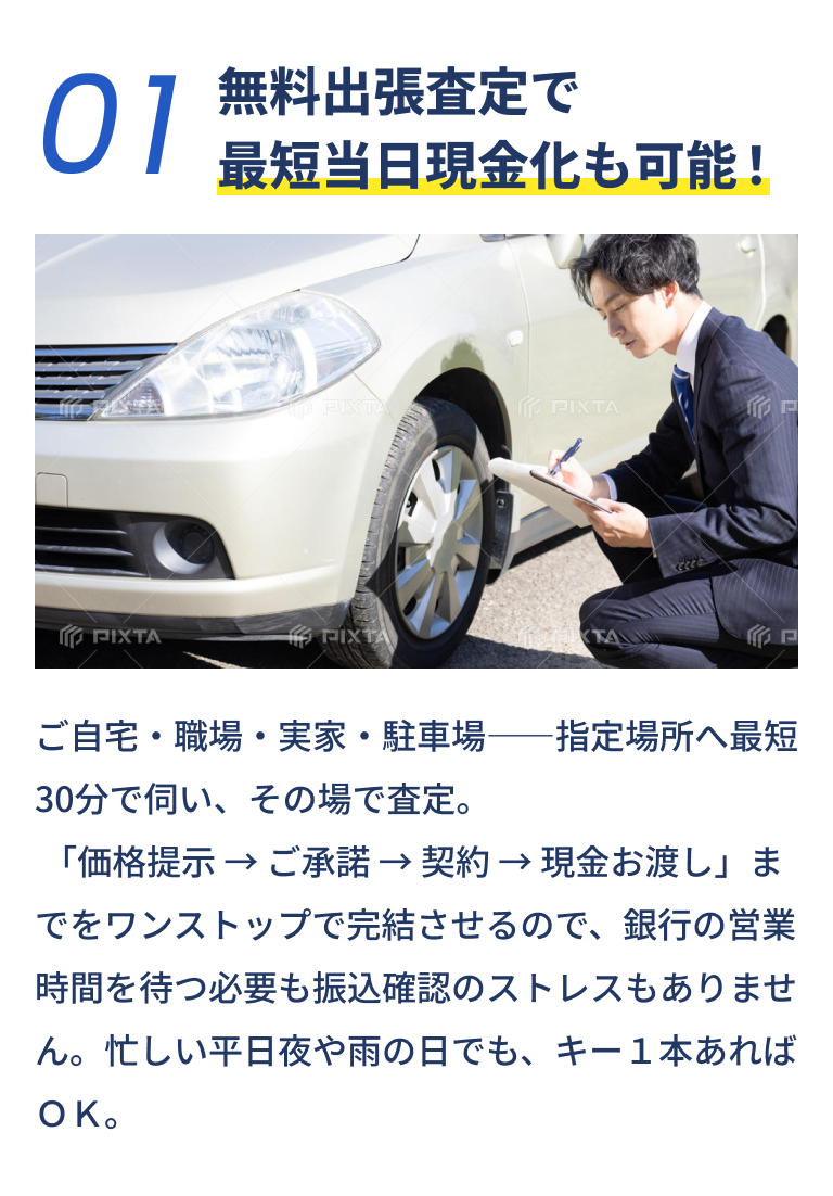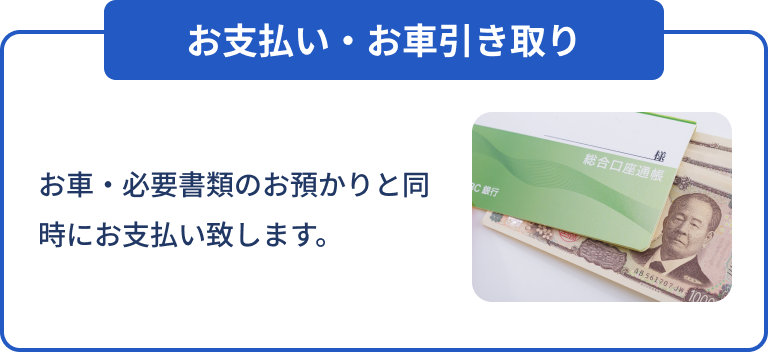 ご成約後、**現金手渡し or 銀行振込(即日振込対応)**をお選びいただけます。当日現金化をご希望の場合は査定時にお知らせください。