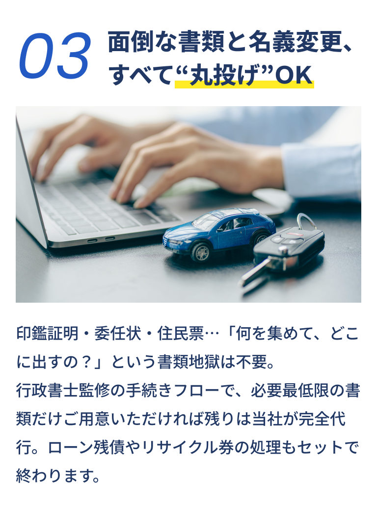 基本的に「車検証」「自賠責保険証明書」「実印」「印鑑証明(発行3か月以内)」の4点のみ。ローン残債がある場合は残債証明書もご用意ください。その他の書類は当社が代行取得します。